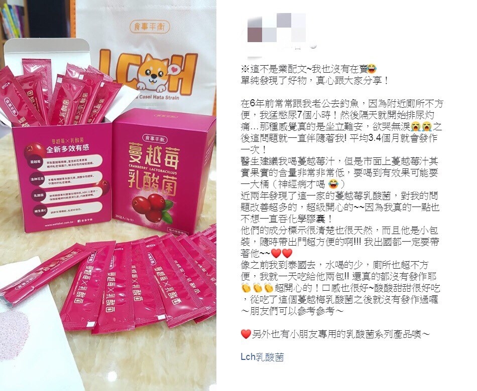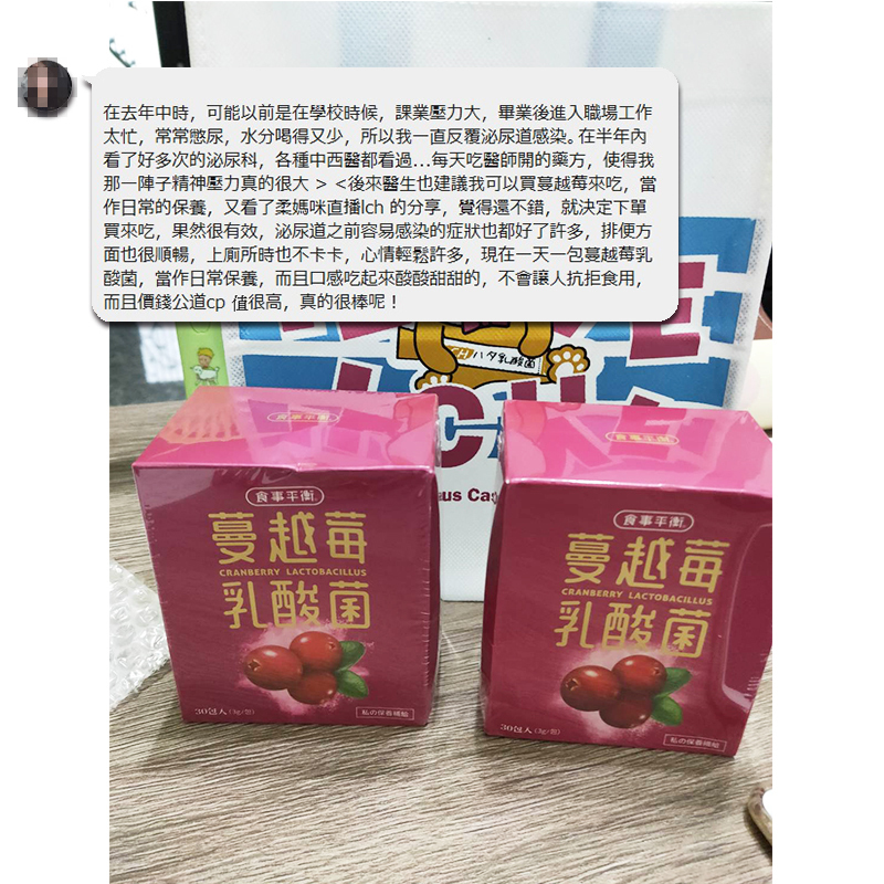 我是三寶媽,在二年前因為顧小孩會憋尿,然後隔天就開始排尿灼痛,那種感覺真的是坐立難安,之後這個問題就一直伴隨著我,平均二個月就發作一次,後來在FB上發現了這家蔓越莓乳酸菌,對我們問題改善超多的!!不再害怕廁所了,很開心認識了這款蔓越莓乳酸菌