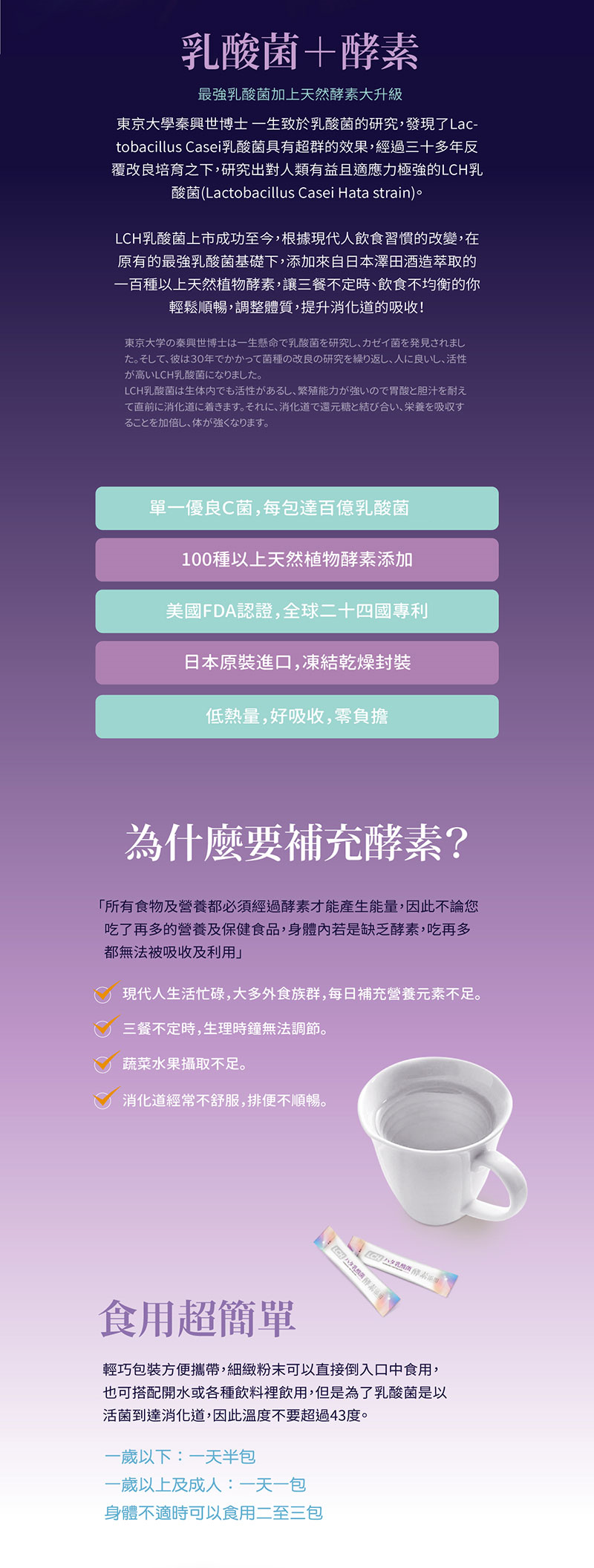 LCH乳酸菌增加消化道好菌,酵素調整身體代謝,採單一優良C菌,融合日本老字號酒廠的發酵技術,添加一百種以上天然植物,萃取酵素菁華,雙重平衡身體健康關鍵,是您不可或缺的營養保護。